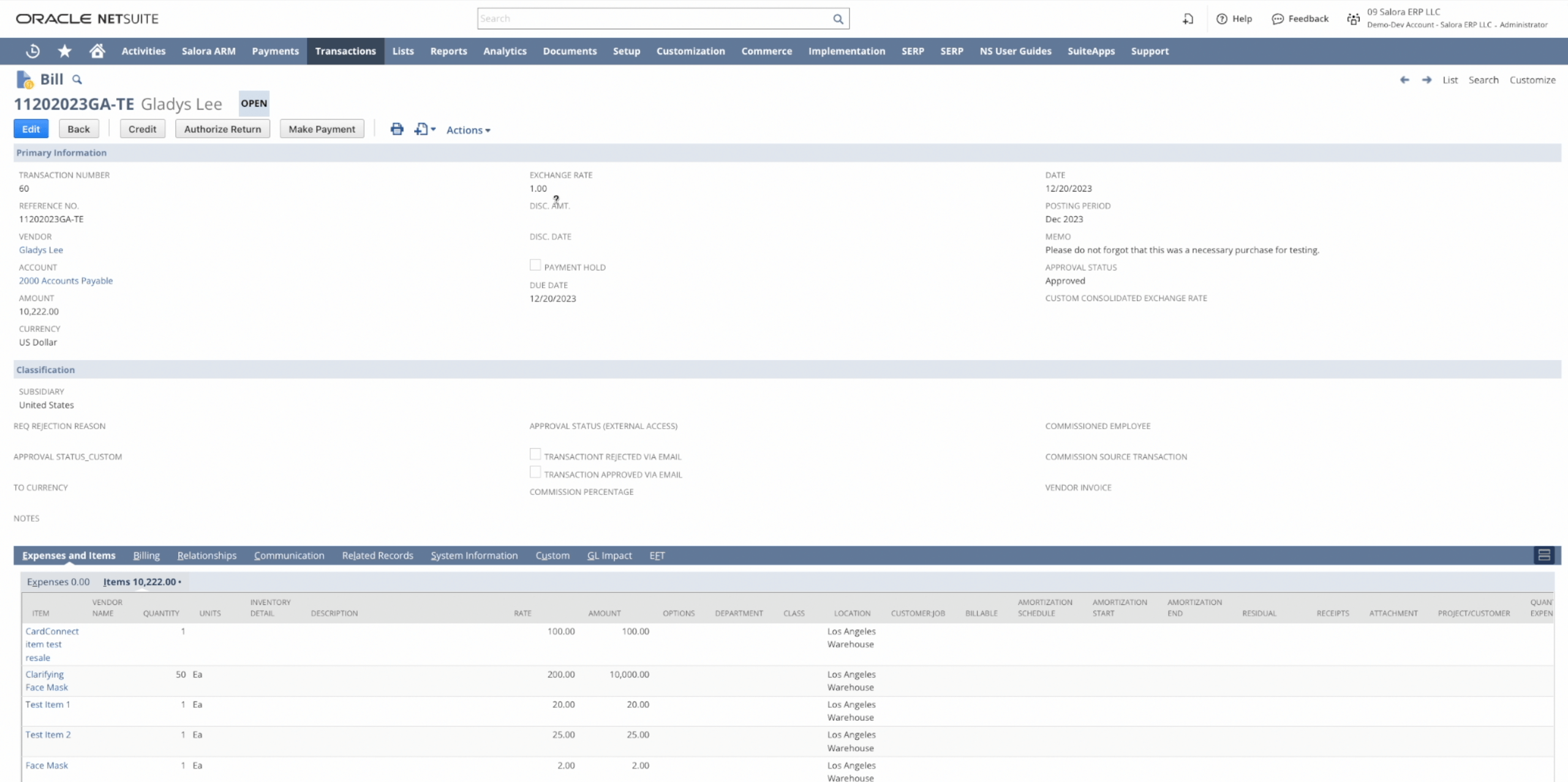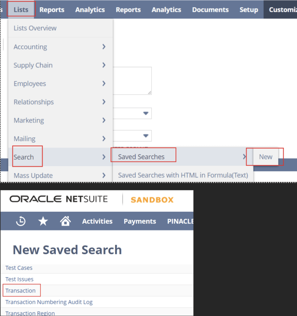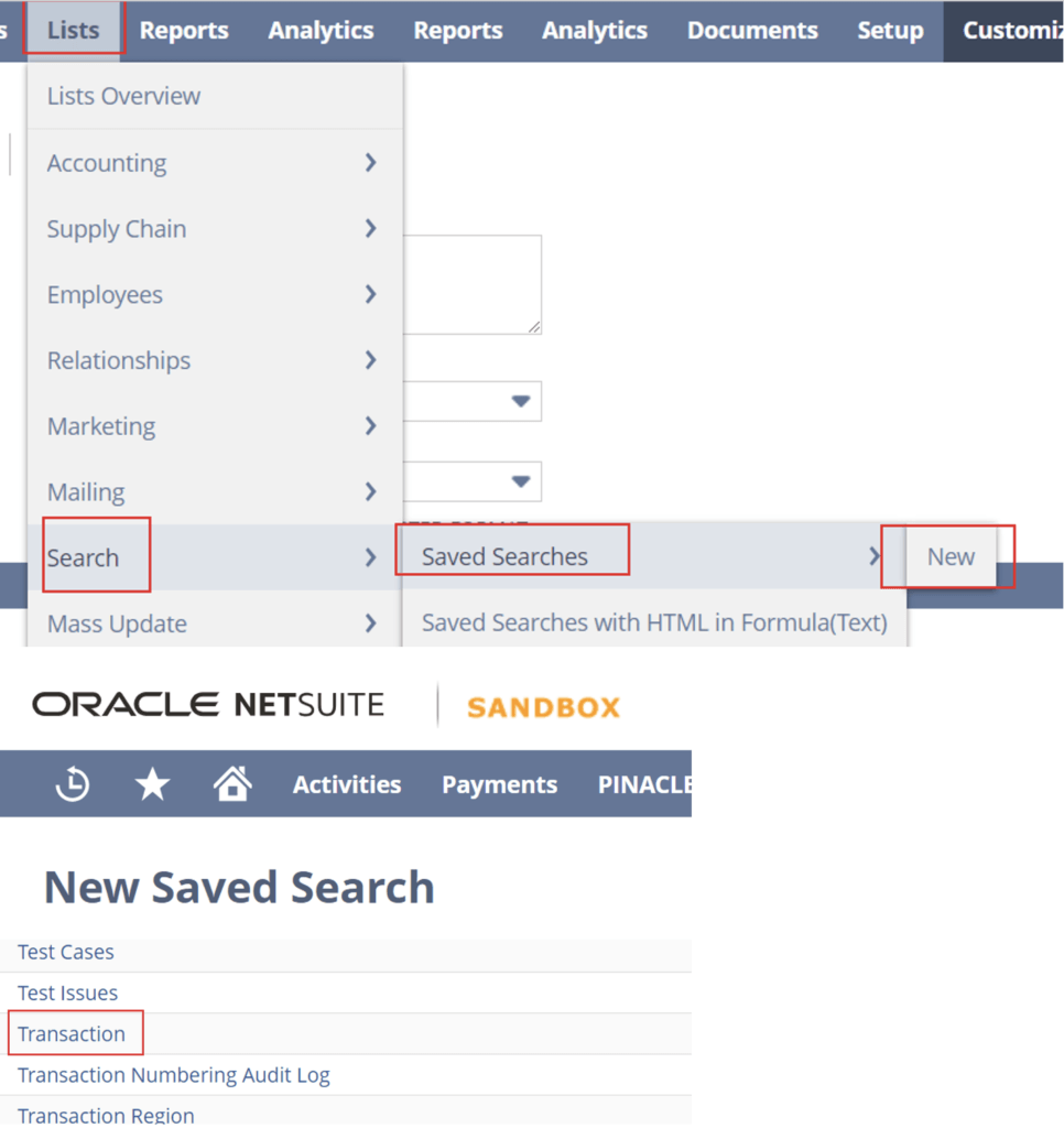 Navigate to Lists > Search > Saved Searches > New > Transaction