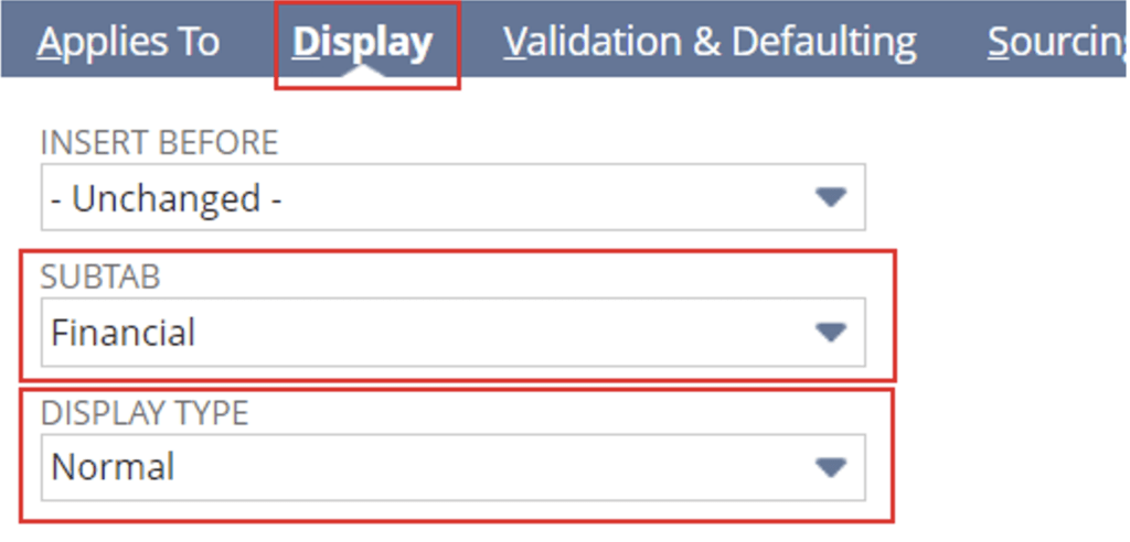Under Display subtab, select Subtab = Financial and Display Type = Normal